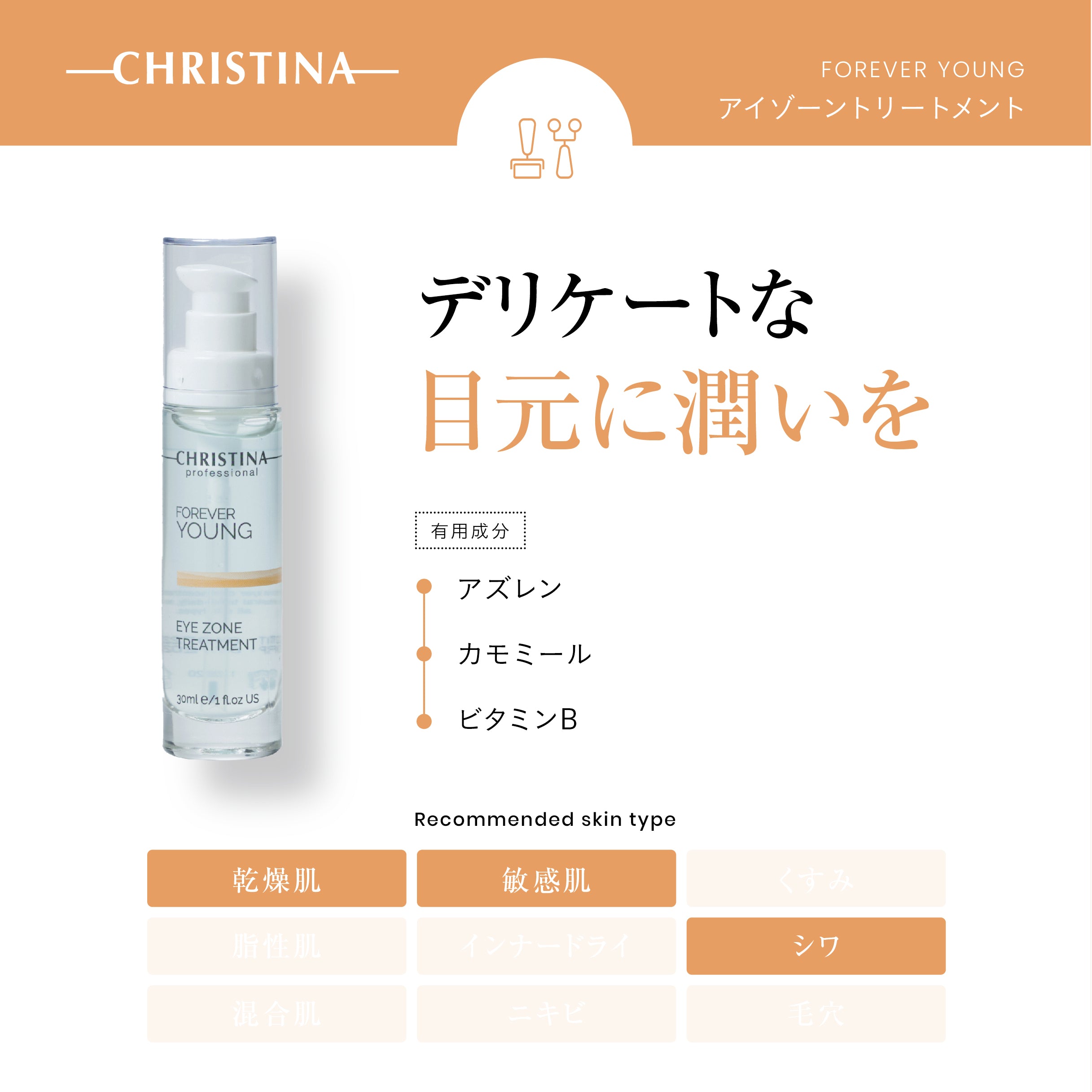 小じわやクマ・むくみは軽減し疲労症状を軽減しながら、目元のエイジングサインを回復し予防します。若返り成分であるペプチド配合でデリケートな目元に潤いを与えながら、なめらかに整え若々しい目元へと導きます。